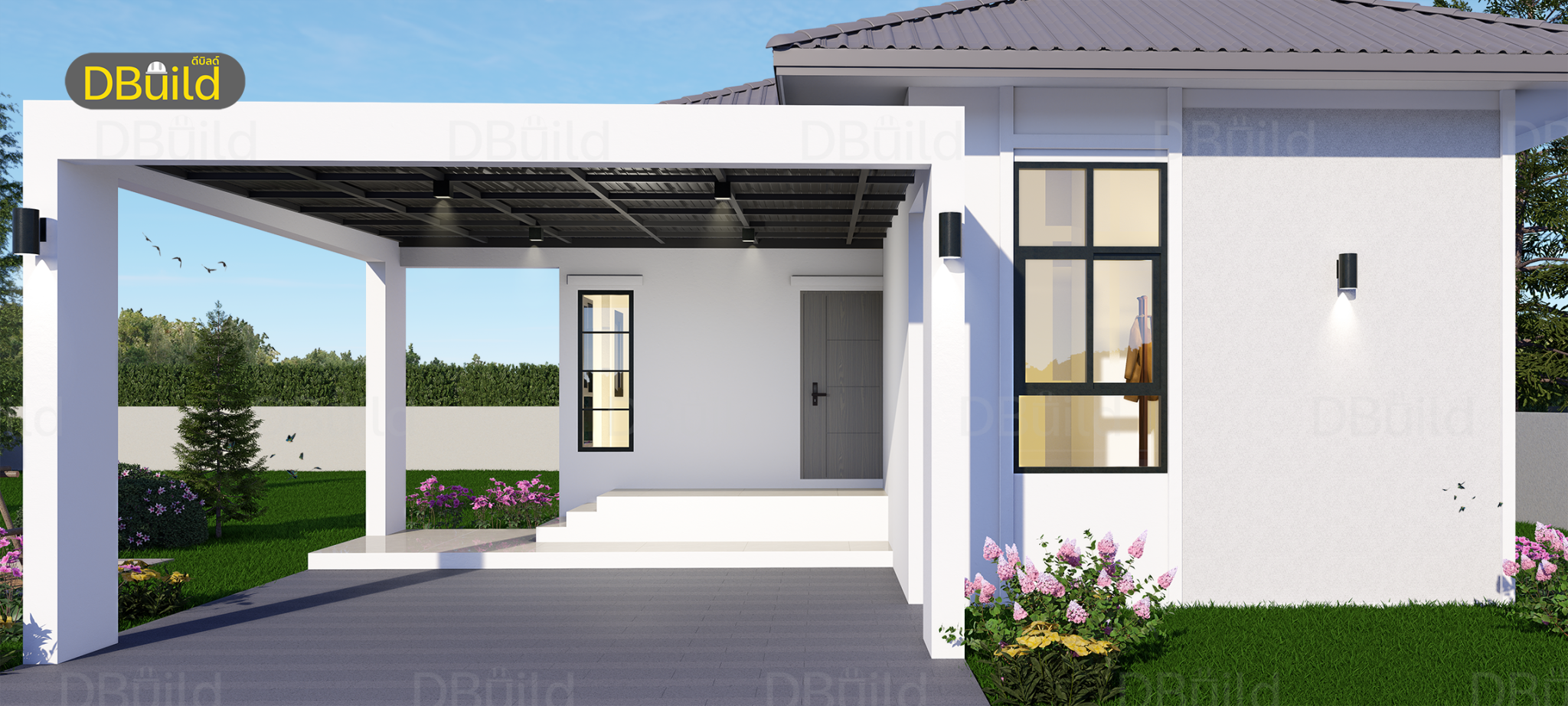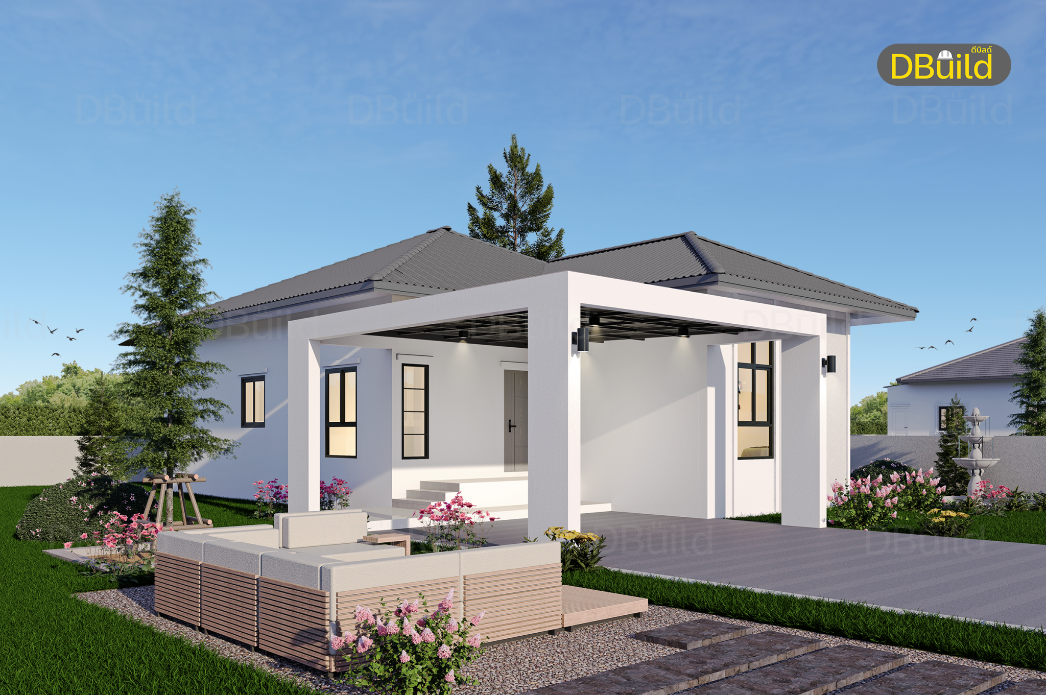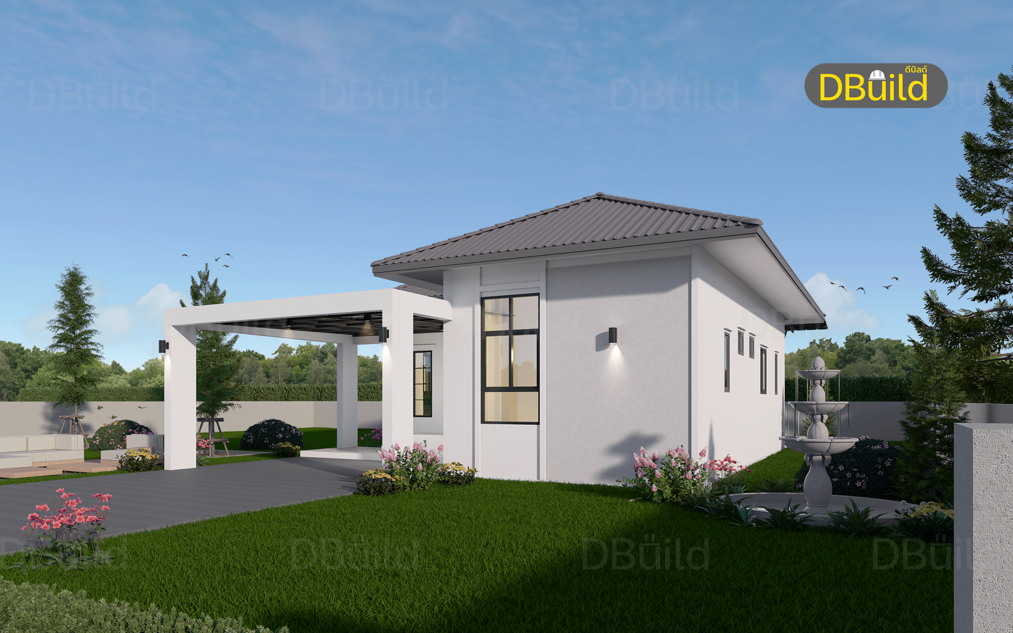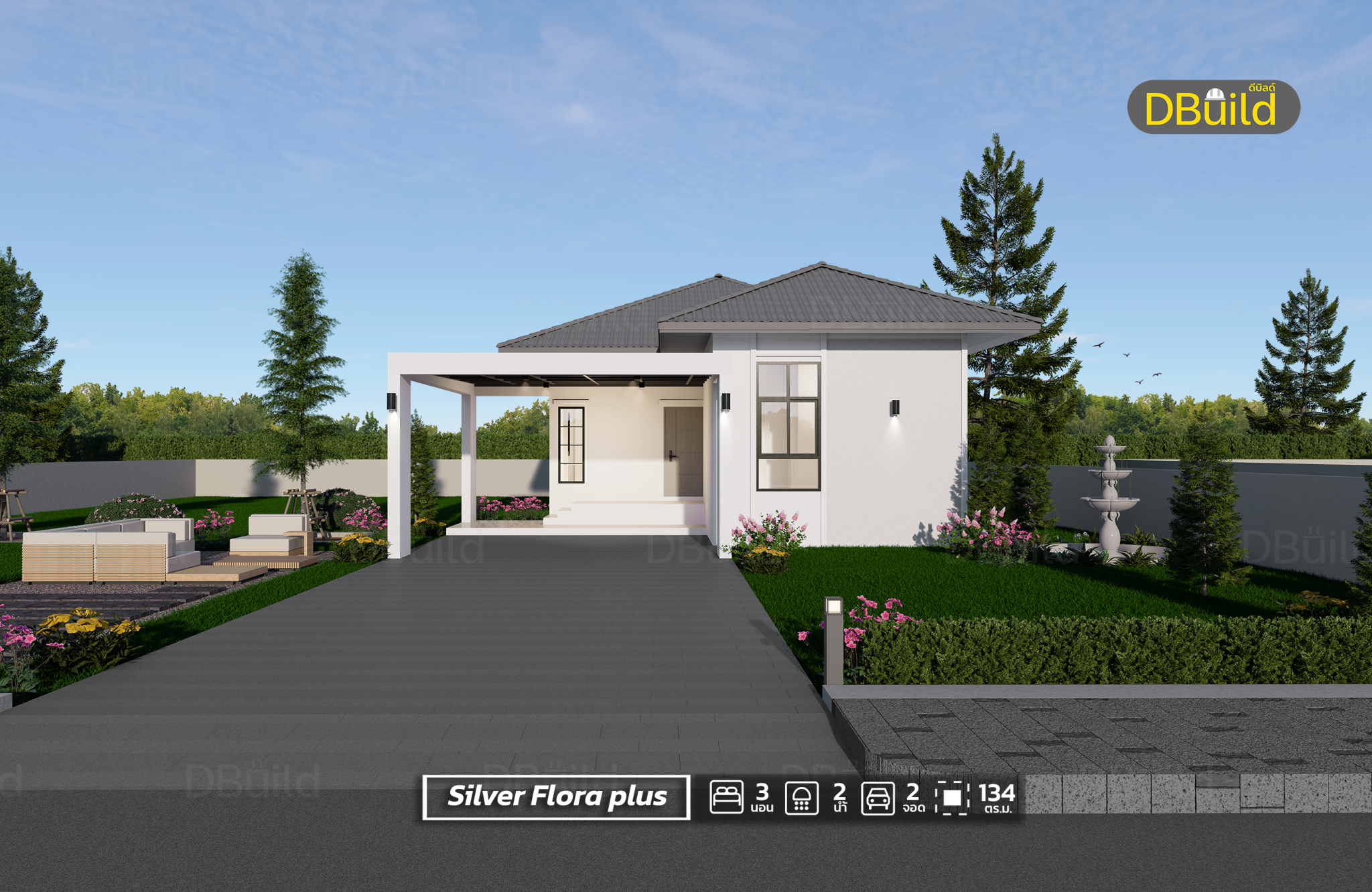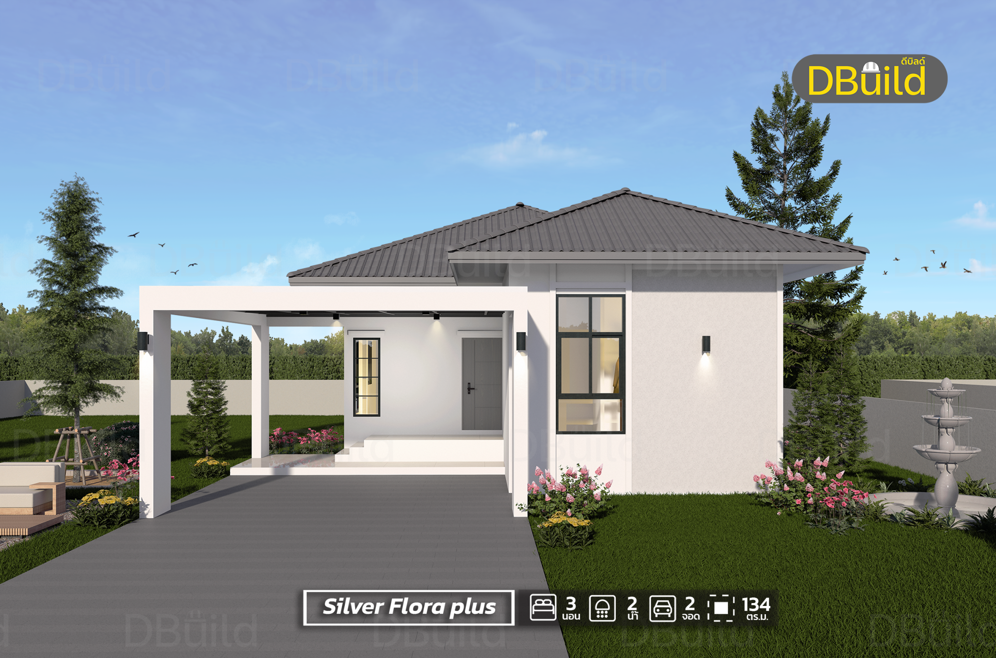 แบบบ้านชั้นเดียว 1 ชั้น 3 ห้องนอน 2 ห้องน้ำ จอดรถได้ 2 พื้นที่ใช้สอย 134 ตารางเมตร